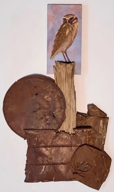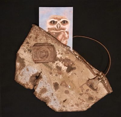 3D metallic desert finds with a mini acrylic painting of an endangered AZ Burrowing Owl (2023)